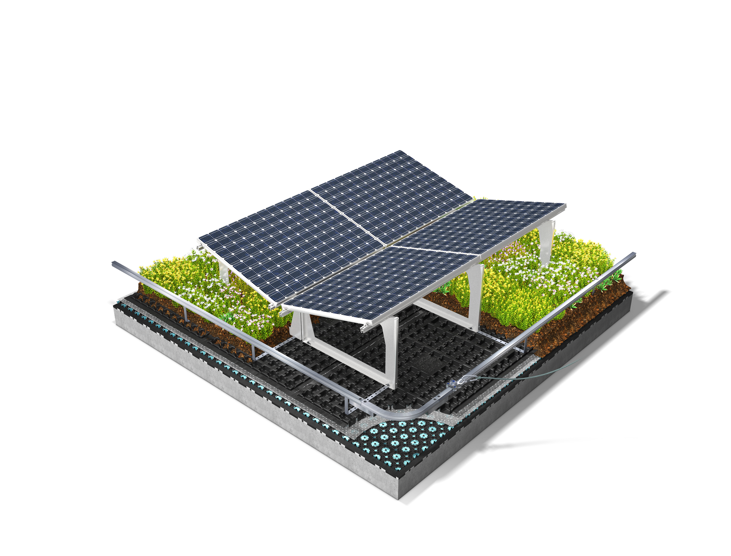 Green roofs combined with solar panels work in synergy. The full range of green roof benefits with no roof penetrations and improved solar panel efficiency.